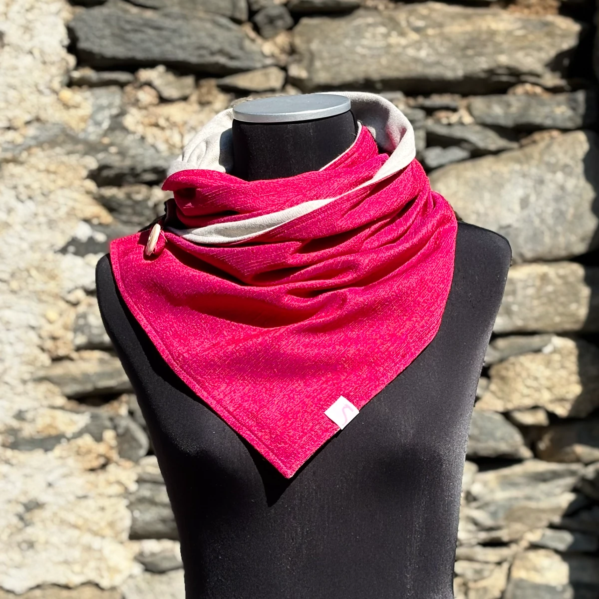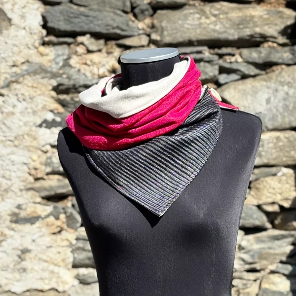 Interno lana panna , esterno seta bourette fucsia e poliestere nero.
