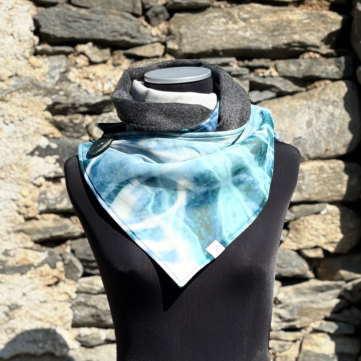 Sciarpa lunghezza circa 125 cm, altezza circa 35 cm, apertura con asola e bottone.
