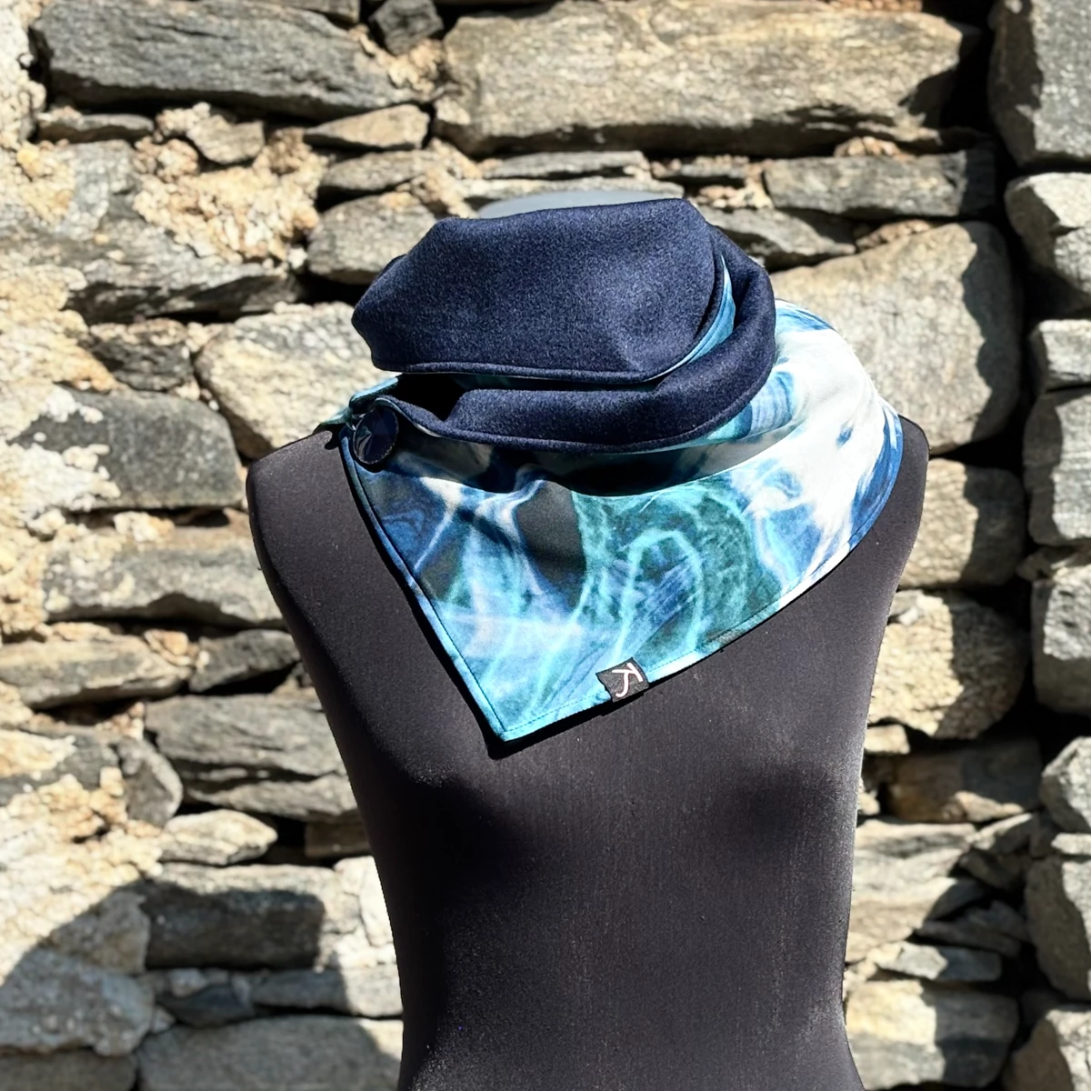 Sciarpa lunghezza circa 125 cm, altezza circa 30 cm, apertura con asola e bottone.