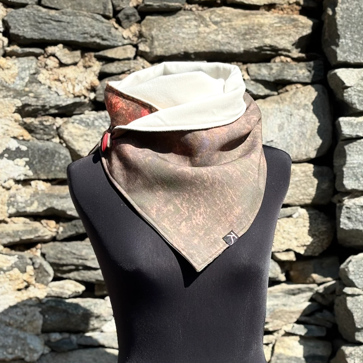 Sciarpa lunghezza circa 125 cm, altezza circa 30 cm, apertura con asola e bottone.
