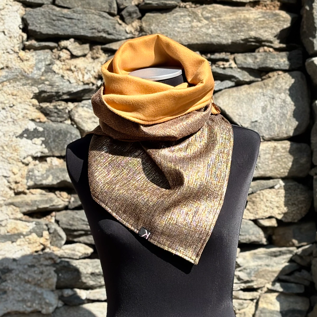 Interno lana senape, esterno seta burette cangiante.