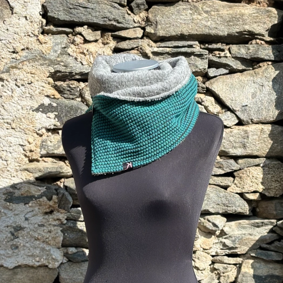 Sciarpa lunghezza circa 120 cm, altezza circa 20-25 cm, apertura con asola e bottone.