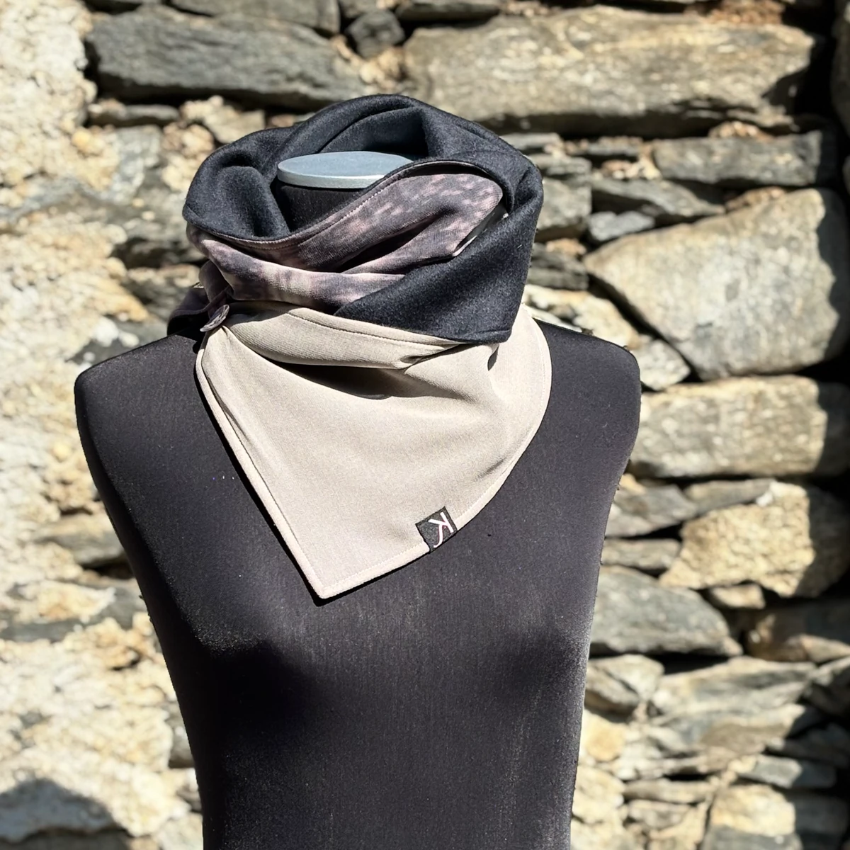 Sciarpa lunghezza circa 125 cm, altezza circa 35 cm, apertura con asola e bottone.